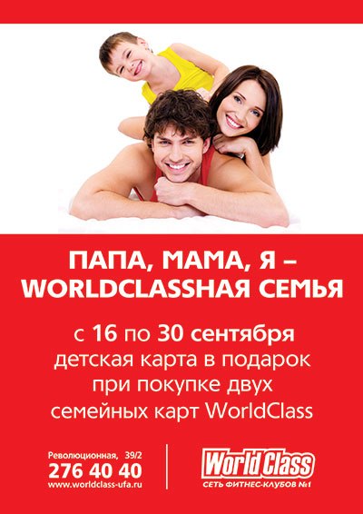 При оформлении годового семейного членства на 2 фитнес-карты с 16 по 30 сентября в подарок 1 годовая или 2 полугодовые карты для ваших детей!